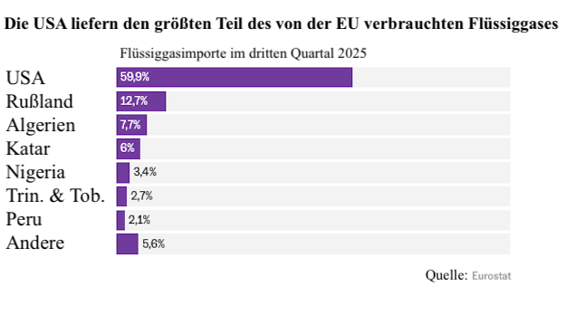Was Gas betrifft, so kommt ein Großteil der EU-Versorgung über Pipelines aus Nachbarländern wie Norwegen, Algerien und dem UK. Nach dem drastischen Rückgang der russischen Lieferungen hat Europa seine Käufe bei weiter entfernten Lieferanten verstärkt. Im letzten Quartal 2025 stammten fast 60% des importierten Flüssigerdgases (LNG) aus den USA, während Algerien und Russland zusammen weitere 20% beisteuerten.“