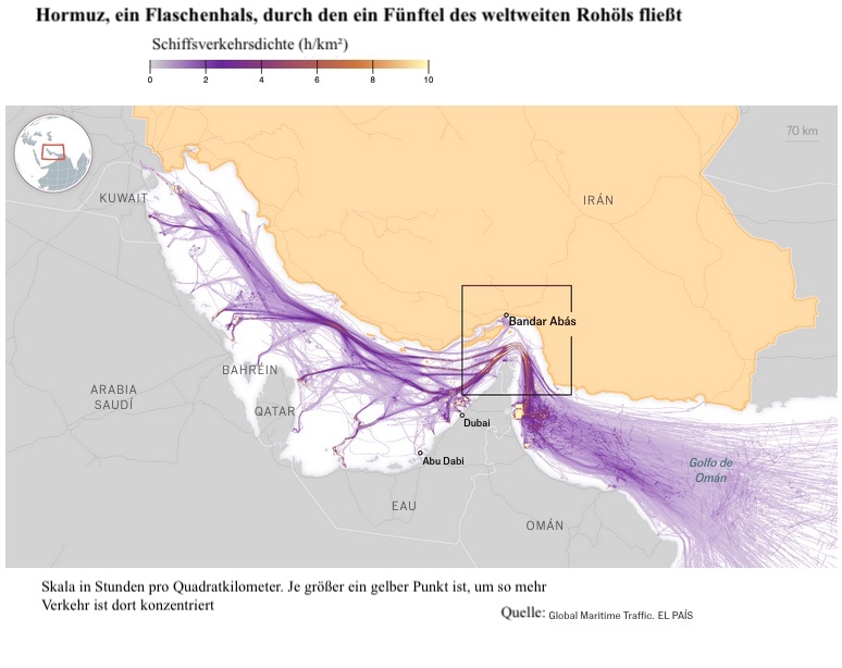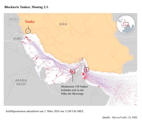 Der Iran hat wiederholt mit der Schließung dieser Meerenge gedroht. Sie ist seit vergangenem Samstag faktisch blockiert, da Bombenangriffe die Durchfahrt von Supertankern und Flüssiggastankern verhindern.