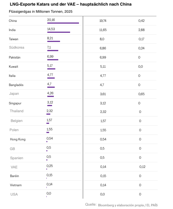 Die Unterbrechung des Schiffsverkehrs stellt auch einen massiven Schock für den Gasmarkt dar, den größten seit dem Einmarsch Russlands in die Ukraine im Jahr 2022. Wie Öl sind auch die Lieferungen von Flüssigerdgas aus Ländern des Nahen Ostens hauptsächlich für Asien bestimmt: Auch hier ist China der Hauptabnehmer.