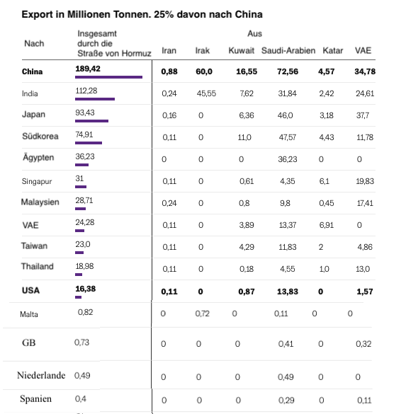 Die Straße von Hormus ist eine lebenswichtige Transportader für die globale Rohölverteilung. Täglich passieren rund 14,5 Millionen Barrel Öl die Meerenge, größtenteils für Asien bestimmt. China gehört zu den Ländern, die am stärksten von der Schließung betroffen sind: Im Jahr 2025 bezog China 25 % der Produktion der Länder der Region.