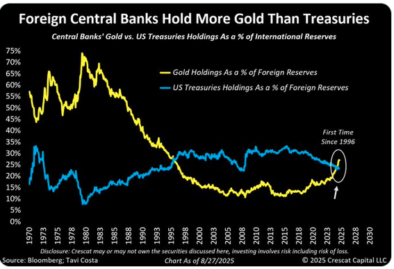 Vor wenigen Tagen veröffentlichte der renommierte Marktanalyst Octavio Costa ein Diagramm, das zeigt, dass Gold in den Bilanzen der Zentralbanken erstmals seit 30 Jahren die US-Staatsanleihen überholt hat.