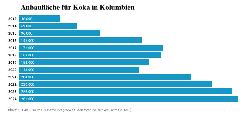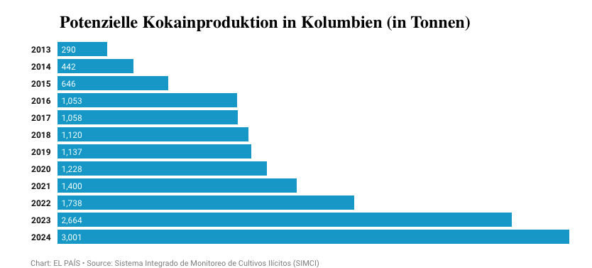 In ihrem noch unter Verschluss stehenden Bericht von 2024 führt das Büro der UNO für Drogen- und Verbrechensbekämpfung (UNODC) den Anstieg der potenziellen Kokainproduktion auf die Zunahme der Anbaufläche zurück, jedoch nicht ausschließlich.